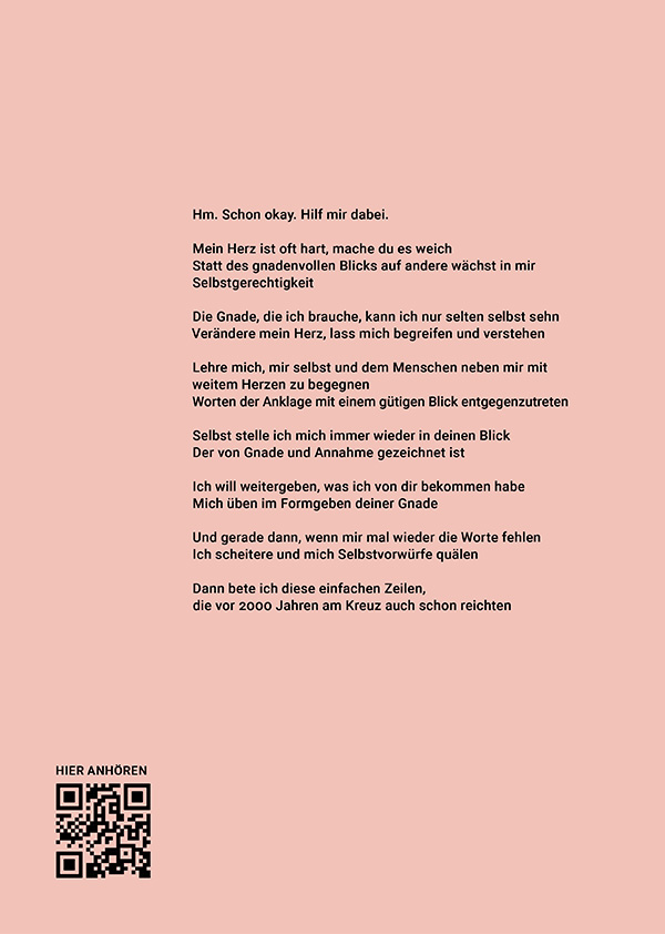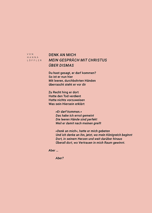 Sechs biblische Personen, die Jesus auf dem Weg zum Kreuz begegnet sind und durch diese Begegnung persönliche Veränderung erlebt haben, können entdeckt werden. Bilder, Spoken Word Audios und Gebete nehmen einen an die Hand und laden ein, ein Stück des Kreuzweges mitzugehen.